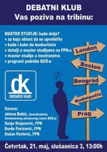 Ova tribina je imala za cilj da pomogne studentima našeg fakulteta u odabiru master studija, kako na našem fakultetu, u Srbiji, tako i u inostranstvu. Studenti su mogli da dobiju sve potrebne informacije pa čak i da saznaju kako i kada da konkurišu za master studije. Takođe, studenti su bili upoznati sa programom podrške Beogradske otvorene škole.